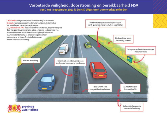 De provincie Zuid-Holland verbetert de doorstroming, duurzaamheid en veiligheid van de N59. Aannemer Heijmans plaatst een geleiderail tussen beide weghelften, om daarmee de kans op ernstige ongelukken te verkleinen. Bij deze werkzaamheden worden de bestaande weg en materialen zo veel als mogelijk hergebruikt.